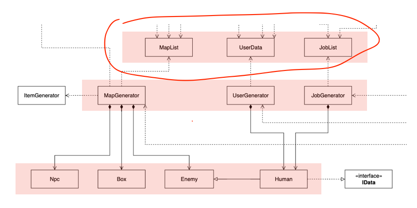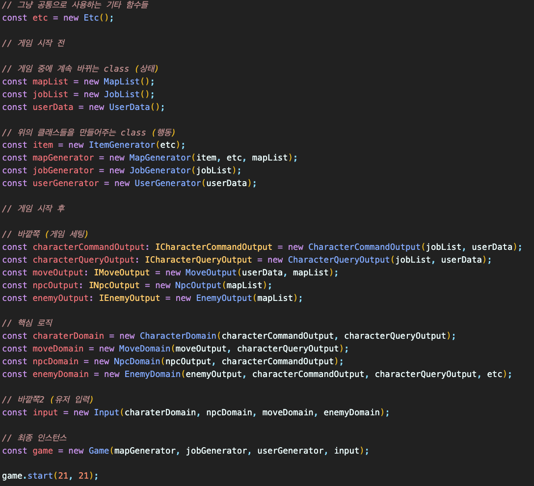 맵을 만들어 맵 상태를 저장하는 객체에 집어넣는 기능을 하는 게임 세팅 부분은 싱글톤으로 구현했고, 모두 생성자를 통한 의존성 주입으로 구현했다. 하지만 여러 번 인스턴스화가 되어 맵에 종속되어야 하는 NPC, BOX, ENEMY의 경우 객체 안으로 바로 가져와 사용하게 구현했다.