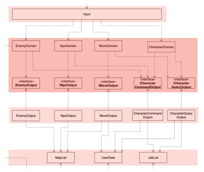 게임 진행 부분은 명확하게 계층이 분리되게끔 구현했다. 먼저 맨 위에 유저의 입력을 받는 Input 계층, 그리고 중간에 진하게 표시된 머드 게임 프로그램의 핵심로직이 담겨있는 도메인 계층. 게임 세팅을 통해서 생성된 게임 데이터를 핸들링하는 Output 계층으로 나눌 수 있다.